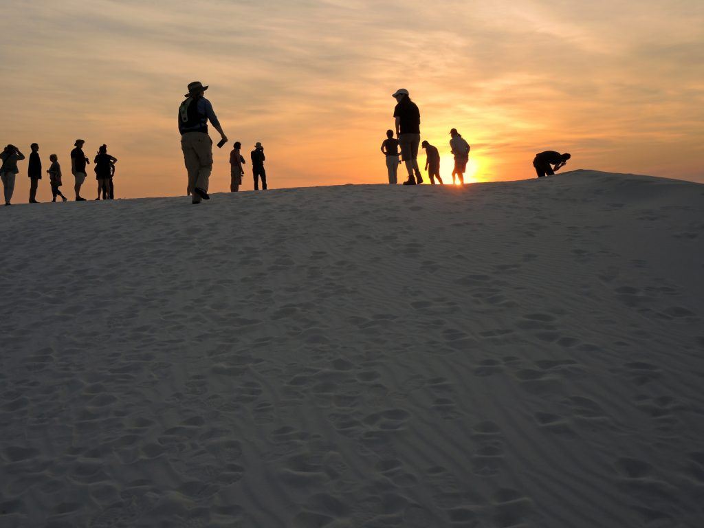 This was made on the White Sands of New Mexico during a sunset ranger walk. I saw it and grabbed it, exposing for the sky. I only got one shot. It has been processed to show the faintest amount of detail in the otherwise silhouetted figures. In this case, the white sand helped fill in the shadows to prevent a completely black silhouette.