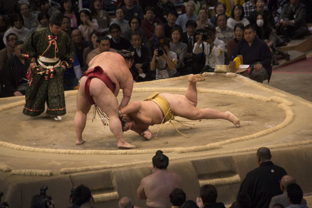 Although large and extremely heavy, sumo wrestlers can move like lightning when the right moment comes. Capturing ‘that moment’ requires either lightning reflexes, or you can just set the camera to shoot in ‘continuous high’ drive mode and keep going. If I had not had my finger pressed on the shutter button continuously shooting, I doubt I’d have got this action shot when the loser hit the clay. Photograph by Robin Nichols