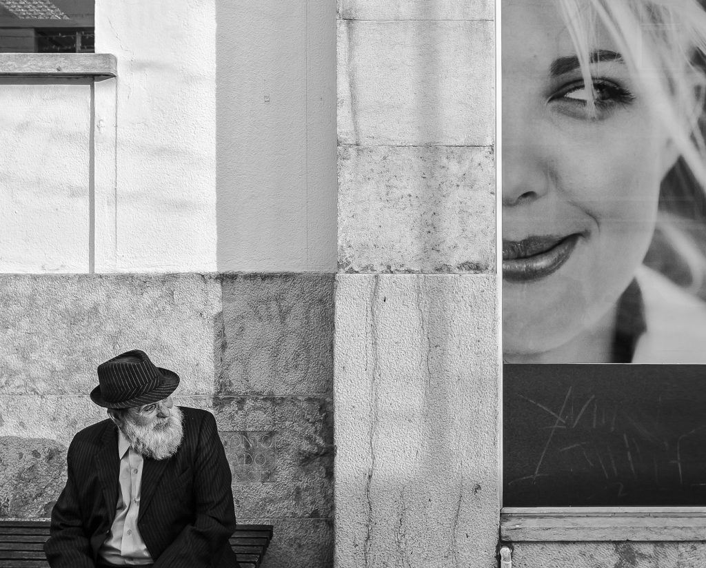 Photography made in the streets fascinates me by the unpredictability, as in jazz, and life. I have a daily routine where I´m doing photos mainly for me, and for pleasure, and usually I do not have a predetermined plan. Sometimes I have referenced a site such as a wall with ads, or shop windows that may be an appropriate background for a good composition — if the right protagonist appears. But I do not wait too long. I love to walk randomly — hoping to find one of the everyday miracles that often happen in the streets. The world is full of opportunities to make great shots that have not been photographed yet. Beauty is everywhere. Of course, I often think that I am very lucky, and that the God of photographers protected me — just at the right time.”