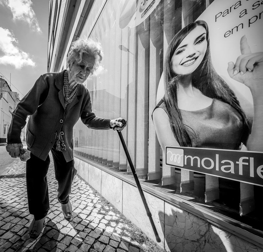 VT: “When they show interest, I’m very pleased to offer a printed photograph. This was the case with the photo of D. Rosa, the elderly woman who walks with a cane next to an ad with a young woman (pictured in this interview). Rarely do people ask for money, but sometimes it happens.