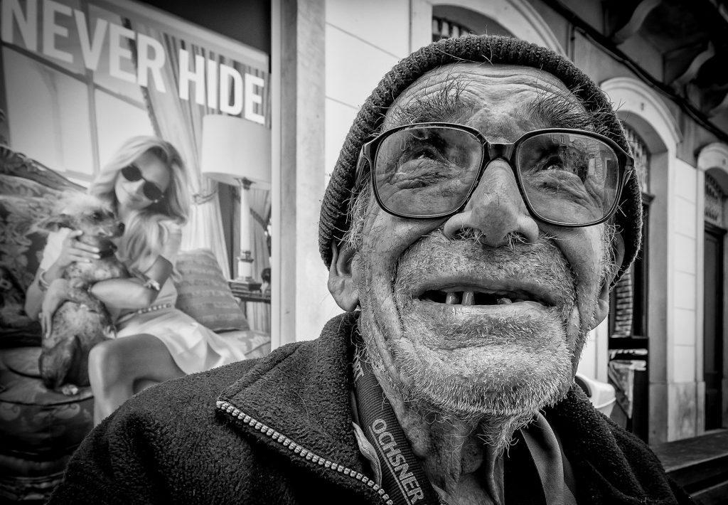 KD: “Your street photography displays two distinct styles. One, such as the photograph of the elderly man and the beautiful woman in the advertisement, and the second being those penetrating close-up portraits. Despite the fact that these two styles are very different in their structure — and how you would go about creating them — they carry an undeniably similar theme. You have really nailed the concept of capturing the human condition. Tell us, why do you think that is? Was it your background in medicine? Was it the way you were raised? How did you develop this ability to creatively interpret the world of the streets?”