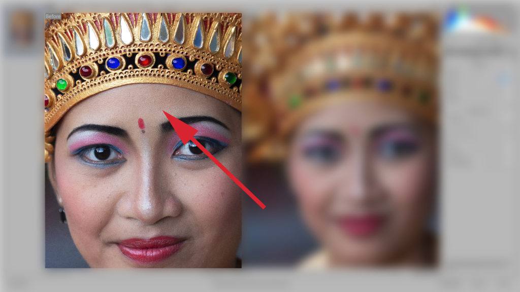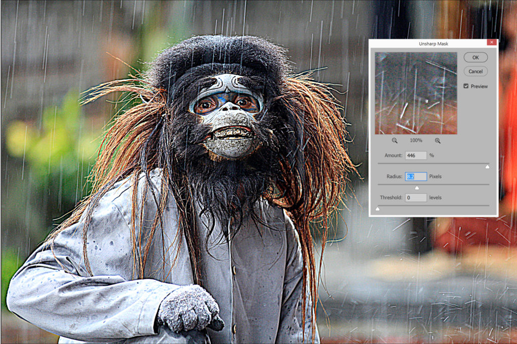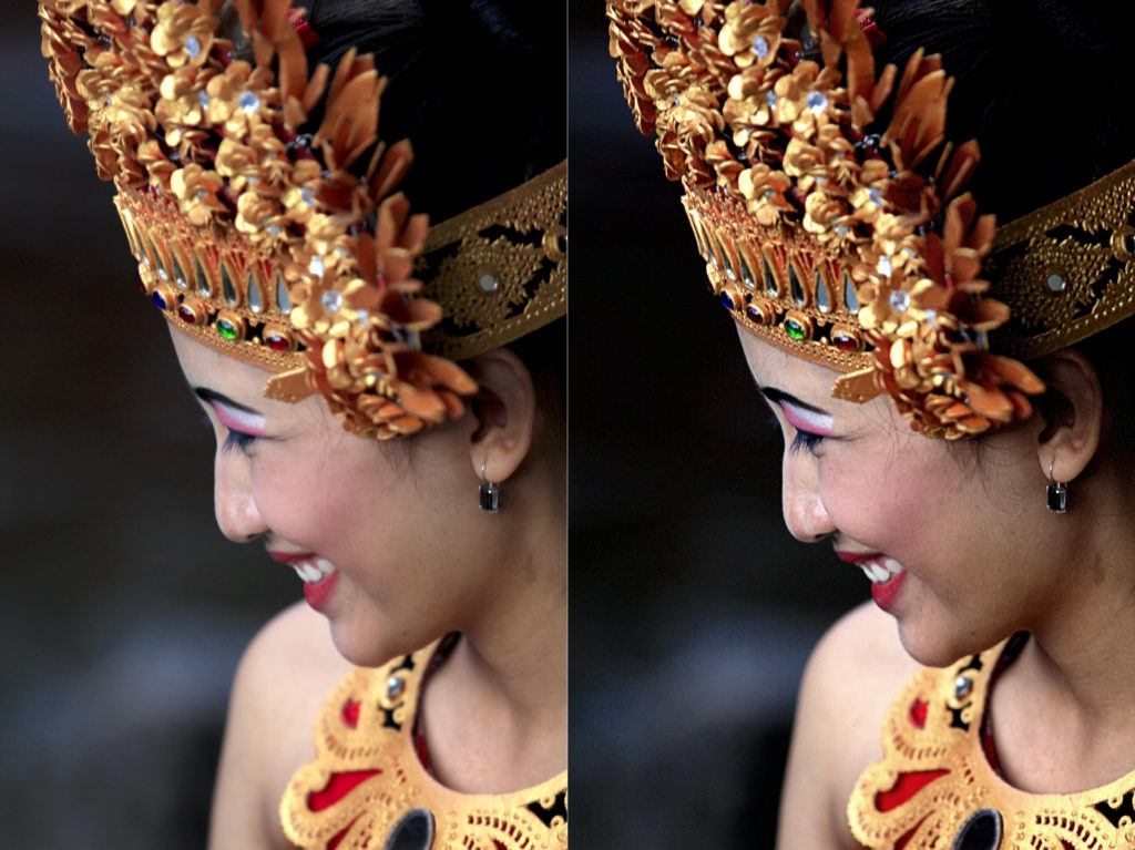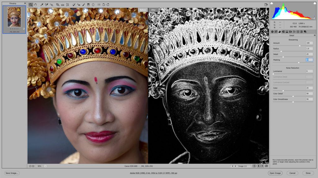 The illustration above should highlight both the huge advantage of using USM on a picture and its downsides. In this screenshot, I added too much on the Amount, Radius, and Detail sliders, which made the skin tones, in particular, appear gritty. This Balinese woman was photographed using ISO 400, but with the added sharpening effect it now looks like I had the camera set to ISO 3200 or higher. Using the mask will temper this negative effect.