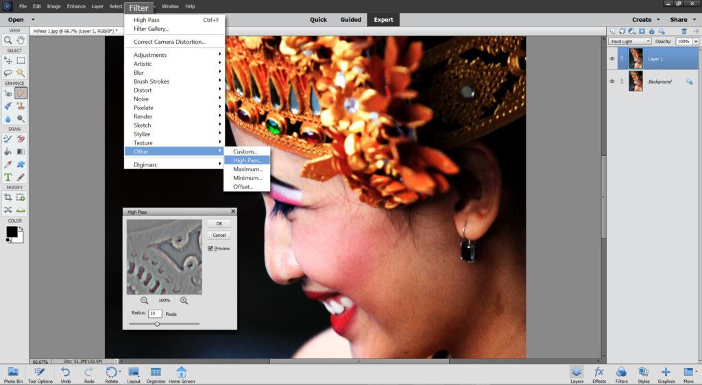 Mode from Normal to Soft Light, Overlay, or Hard Light (in order of sharpening severity). - Find the High Pass filter (Photoshop CC > Filter > Other > High Pass).