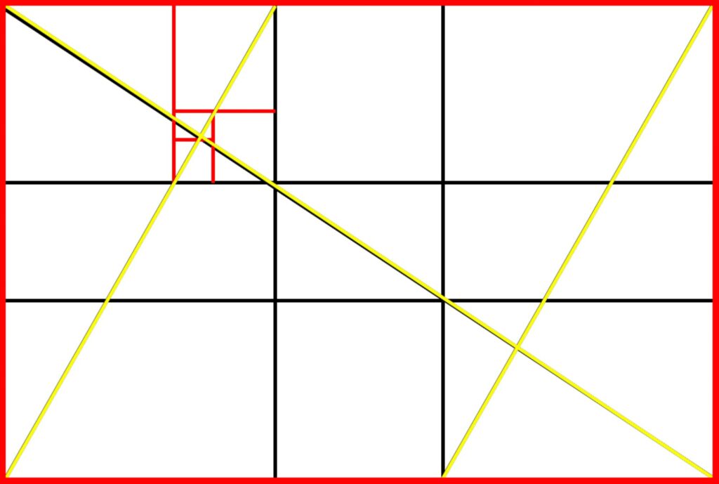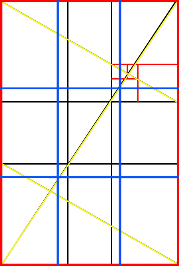 This graphic depicts a vertical frame with the following uses of space overlayed within the frame: the Rule of Thirds (blue), the Golden Spiral ‘sweet spot’ (red), the Golden Ratio grid (black), and the Triangle grid (yellow). Graphic by Kent DuFault