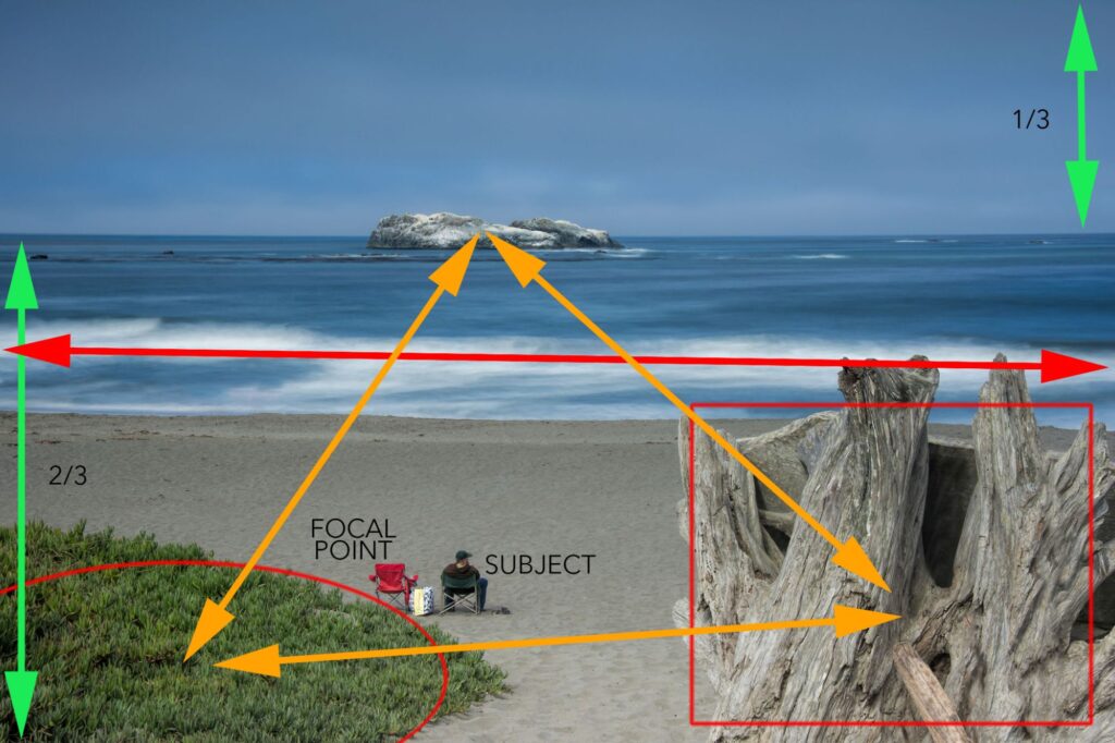 - I encircled my subject area with a triad of points, including driftwood, grass, and rocks. This use of a triangle also created a vibrant sense of depth and distance.