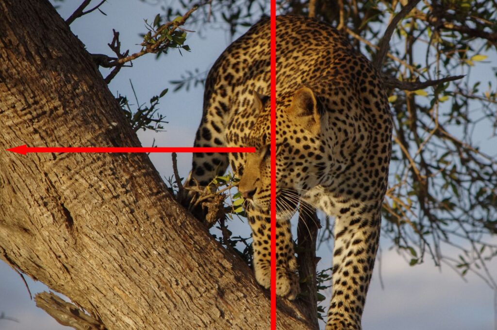 In the image above, you can see that the frame is divided into a 1/3 – 2/3rd use of space, which is a common and accepted practice. However, the big cat is looking intently at the short side of the space. This is a frame break. Again, it is not the worst thing in the world, but it can be improved. Let me show you how.