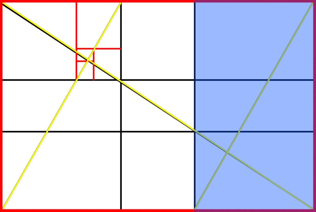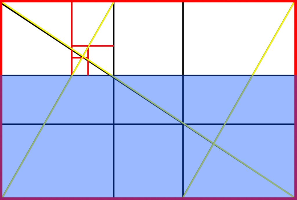 This graphic represents the Fibonacci ‘sweet spot’ with the Golden Ratio grid and the Triangle grid laid over it. This use of division and space was incorporated into the image on the page (image #5) of the big cat. Graphic by Kent DuFault