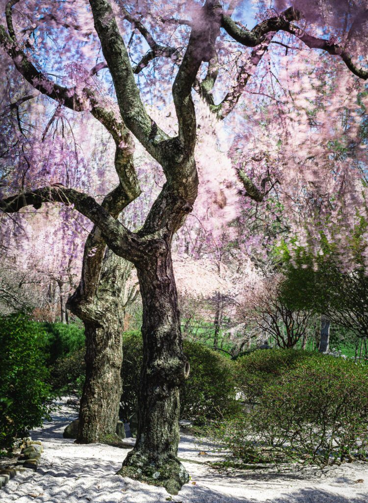 Notice that the tree trunks are sharp in this image, but the cherry blossoms blur. The camera recorded movement in the breeze as motion blur. My settings were 5 seconds @ f/16, ISO 100. Photograph by Jenn Mishra