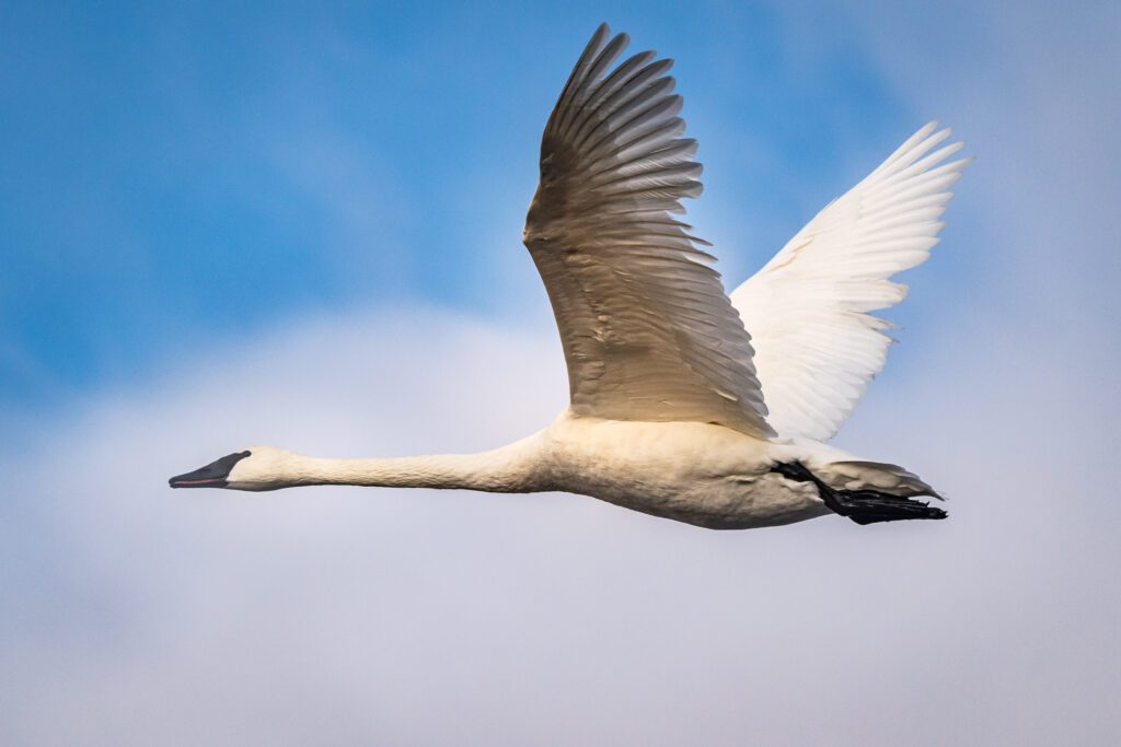 I had plenty of light to work with on this sunny morning. So, to capture this Trumpeter Swan flying by, I set my shutter speed at 1/2000th of a second to freeze the bird in flight. Photograph by Jenn Mishra