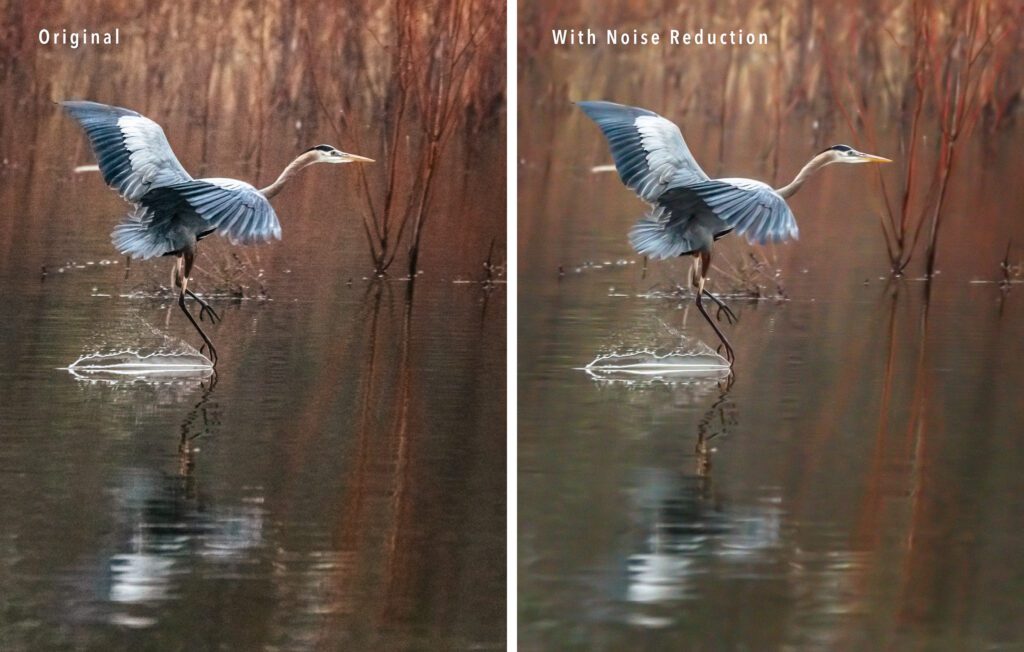 The light was fading as this Great Blue Heron landed so I set my ISO at 6400. This created noise in the image. But much of the noise I removed later in post-processing. Photograph by Jenn Mishra