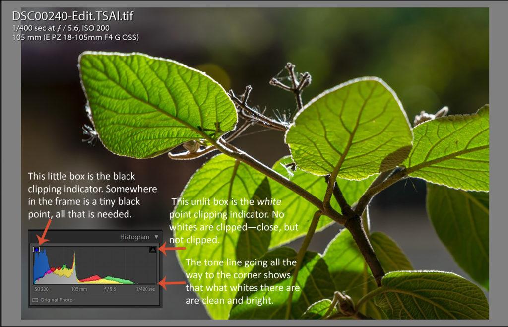 Look at the dark end of the histogram in the screenshot above. The black clipping indicator is lit, barely, but there. It tells me that somewhere there is a black point, ensuring that the picture has all the scale possible, called “long scale.” The remainder of the tones and colors in the picture are represented by that very shallow sloping ramp going down leftward from the brightest tones to the barely-there black point in the left corner.