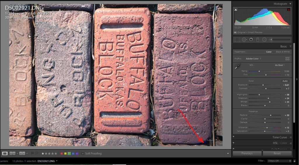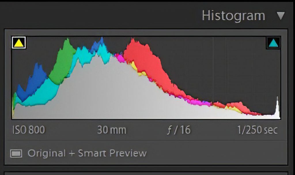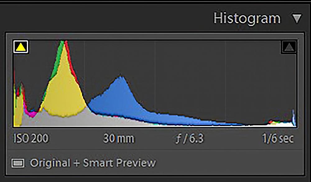 Almost all the tones in the picture are on the right, bright side of the box. The white clipping indicator is barely lit with a little yellow triangle. In the picture itself, you won’t be able to find any blue or red evidence of clipping, but we know from the lit indicator that the whites are truly white (I sound like a detergent commercial). Screenshot by Charles Haacker