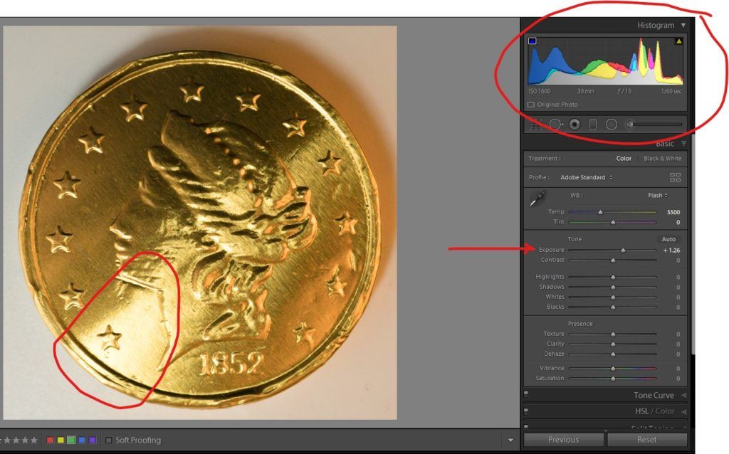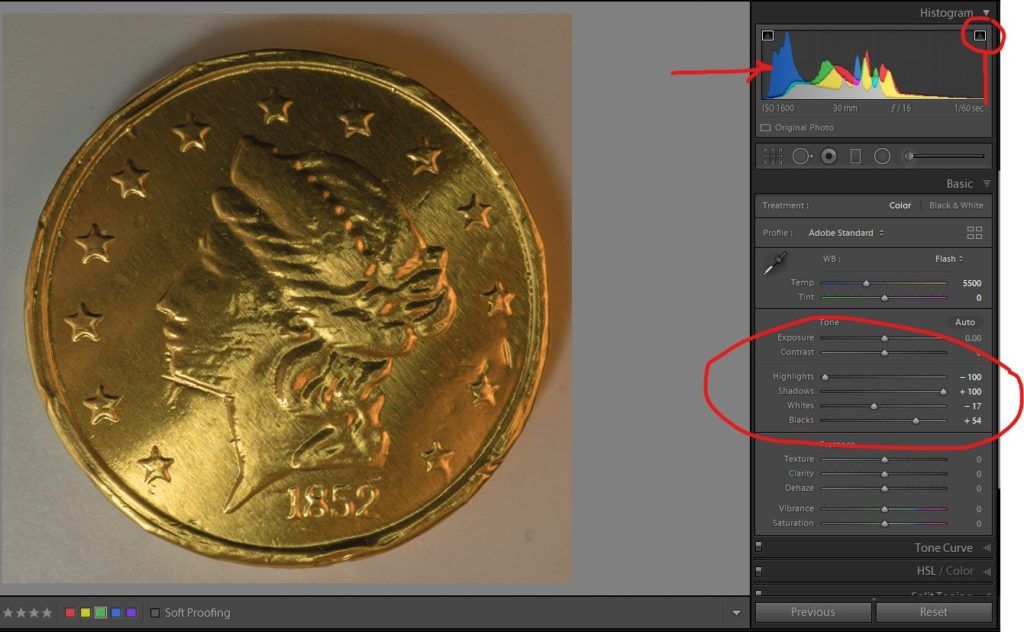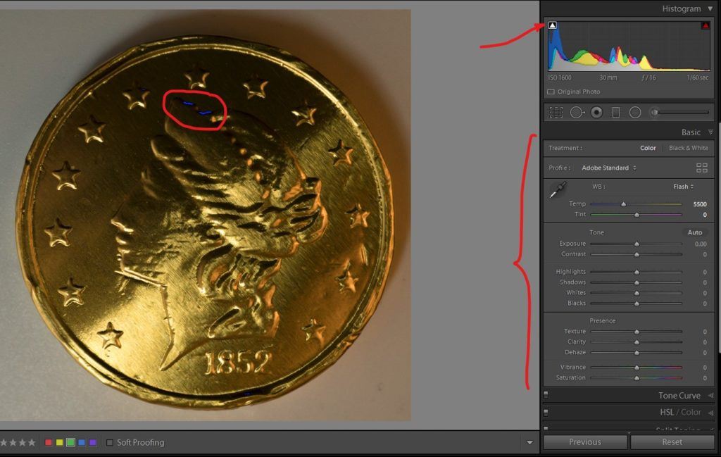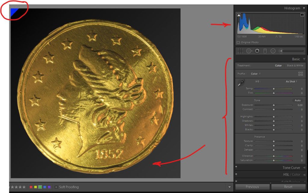 Step 1: I chose an unusual file – a brightly reflective gold Hanukkah chocolate coin – to show how the histogram helps me. I shot with a flash bounced off a low ceiling behind me. The circled blue squiggles are clipped shadows (my black point). The arrow in the upper right points to the clipping indicator. The bracket by the basic development module shows that no sliders are adjusted (the color temperature is at default). The exposure is zeroed, but a glance at the histogram shows that the overall tone of the picture is dark, as most of the tones are bunched to the left, dark end of the box.