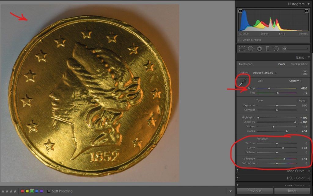 Step 4: I’ve adjusted the color temperature for a neutral gray by using the eyedropper where the arrow is at the upper left. The Presence panel (circled) has adjustments to give a little subtle contrast to the piece, but now I don’t care for the big shadow. The histogram has not moved.