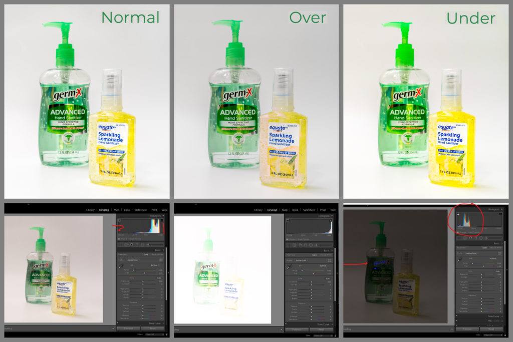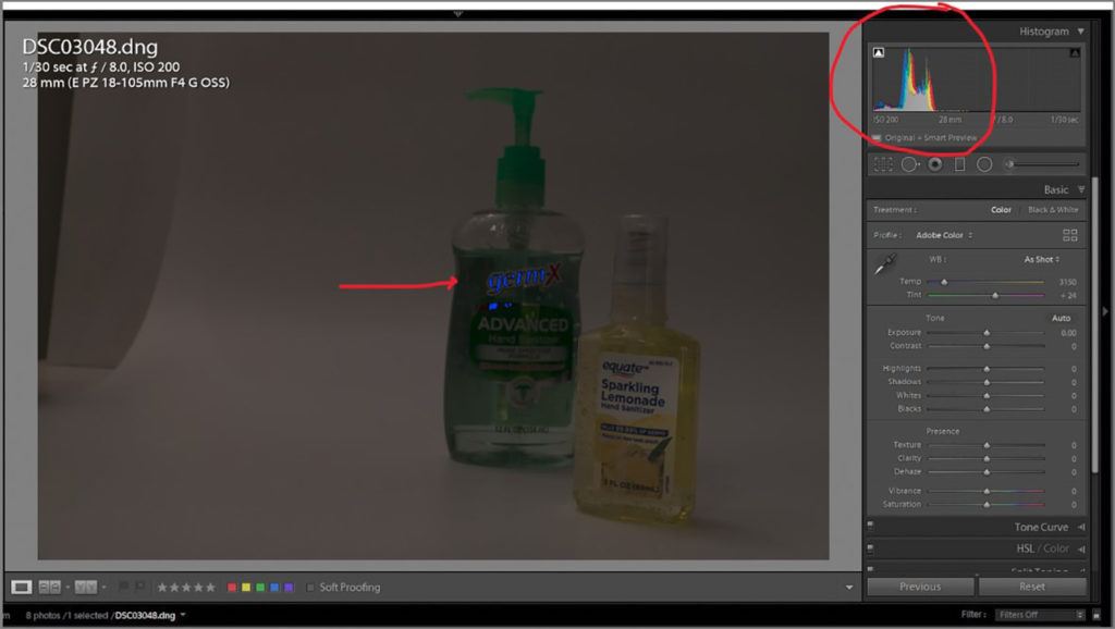 You can see underexposure when you review, but your histogram will verify that you may be underexposing if most of the tones are crowded and spiked at the left, dark end of the box. The red arrow points to the very-much clipped black text on the bottle.