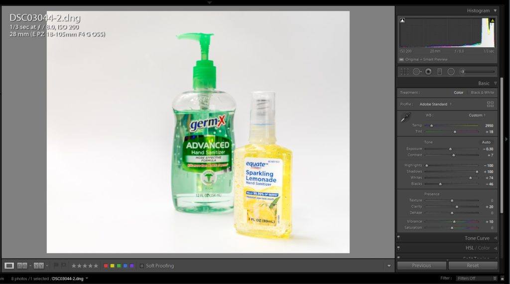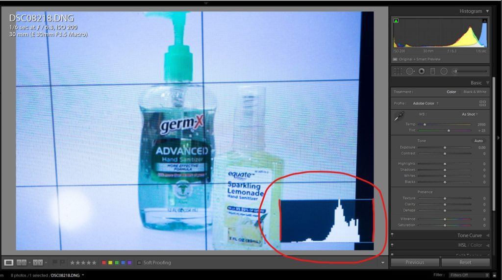 This is the in-camera histogram as I was taking the photo with normal exposure. Keep in mind that these are bright, translucent objects in a white set. It should look bright and airy. I use mirrorless cameras that are in full-time live view. They let me display the camera’s onboard histogram right in my finder. I think DSLRs can only display it in the review or live view. It’s nice to be able to see it in real-time. This camera histogram is very similar to its Lightroom histogram: crowded and spiked to the right, reflecting that the overall picture is very bright.