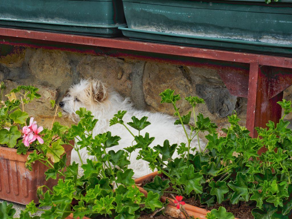 I admit that I inordinately enjoy animal pictures, but it is likely that your audience will as well. I often find that at the end of the day, the shot I like the best is the one of the local cat or dog, just like this shy vineyard dog.