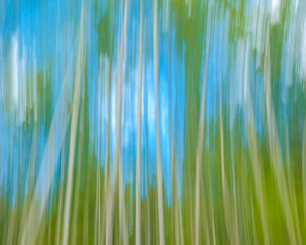 I took the picture below on a whim. I wanted to capture the white bark of the birch trees, the green foliage and the blue sky. But I didn’t want to take a boring shot of some trees, so I used a technique called ‘intentional movement.’ I disabled the stabilization on my lens and set the shutter speed to 1/8th of a second. I twitched my hand as I fired the shutter, and with some trial and error, created the image you can see.