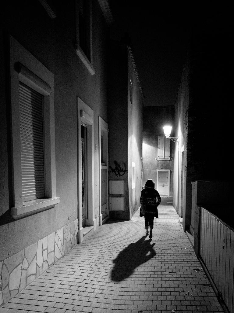 This is an image that conveys a feeling of depth, and it does so with shadows. Try to envision this shot without the contrast. Shot during broad daylight or well lit by multiple lights it would not have the same impact. The shadows along the edge of the wall combine with those of the subject to illustrate distance, and the leading lines of the buildings heighten the effect. While not classical Chiaroscuro, it’s an excellent example of how to create depth.