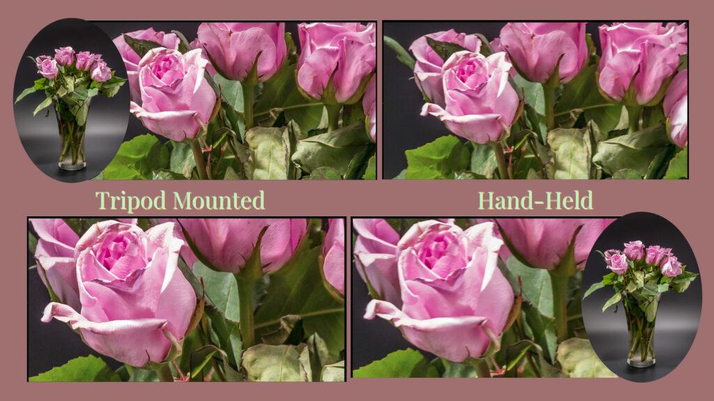 All photos were made with my Sony A6300 with a 30mm normal lens (equivalent to 45mm). All settings identical at 1/30 sec (1 over the focal length), f/4.5, ISO 800. The only difference is that one was made from a sturdy tripod and the other handheld. The roses were enlarged up to 300% (bottom row). You should be easily able to see the difference. Photograph by Charles Haacker