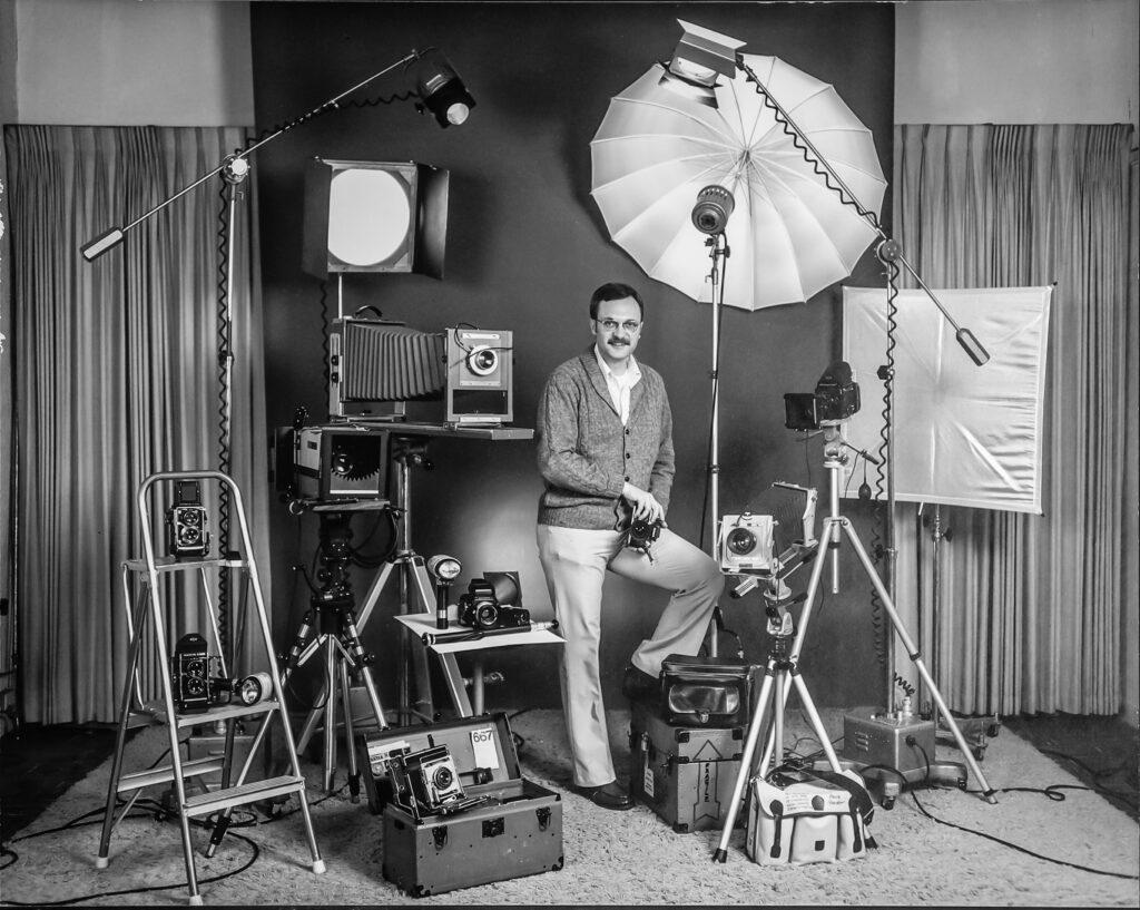 When I had my own studio (with more hair and less stomach), I had a lot of cameras and a lot of tripods, many dedicated to a single camera. There are four tripods visible here. The view cameras (with the bellows) could not be used without one. The Speed Graphic press camera down front could be handheld but has already demonstrated it was better to support it. Studio portrait cameras were almost always set on a tripod so I could frame and compose the portrait, then come out from behind the camera to chat with my client while firing off frames as I saw expressions I liked.