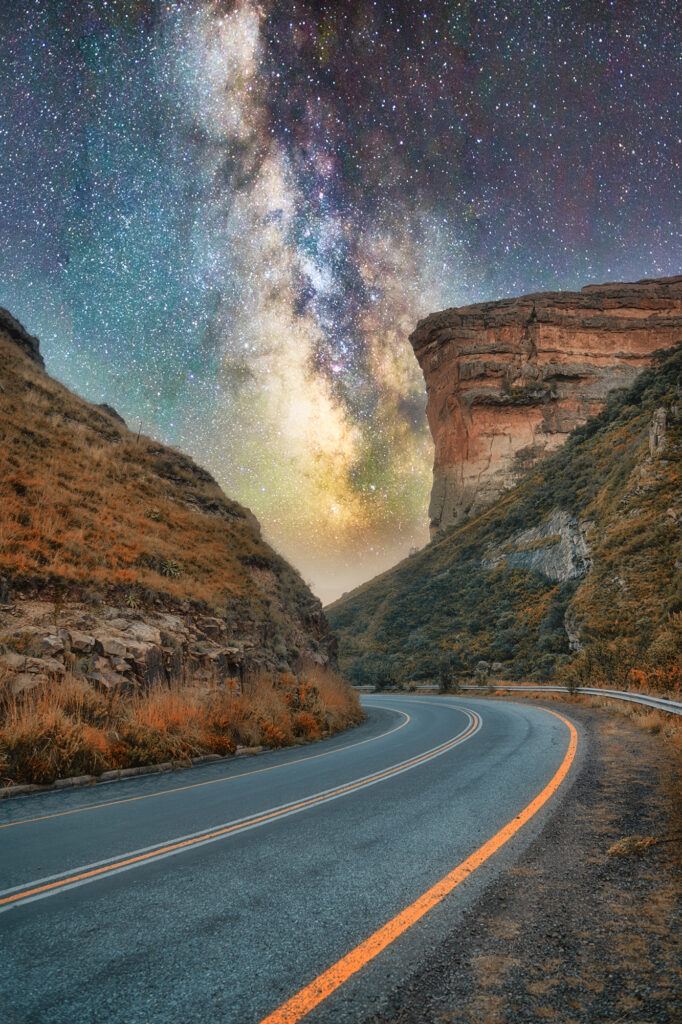 The sweeping curve of the road combined with the upward sweep of the night sky creates multiple leading lines throughout this image. Photograph by Thomas Bennie