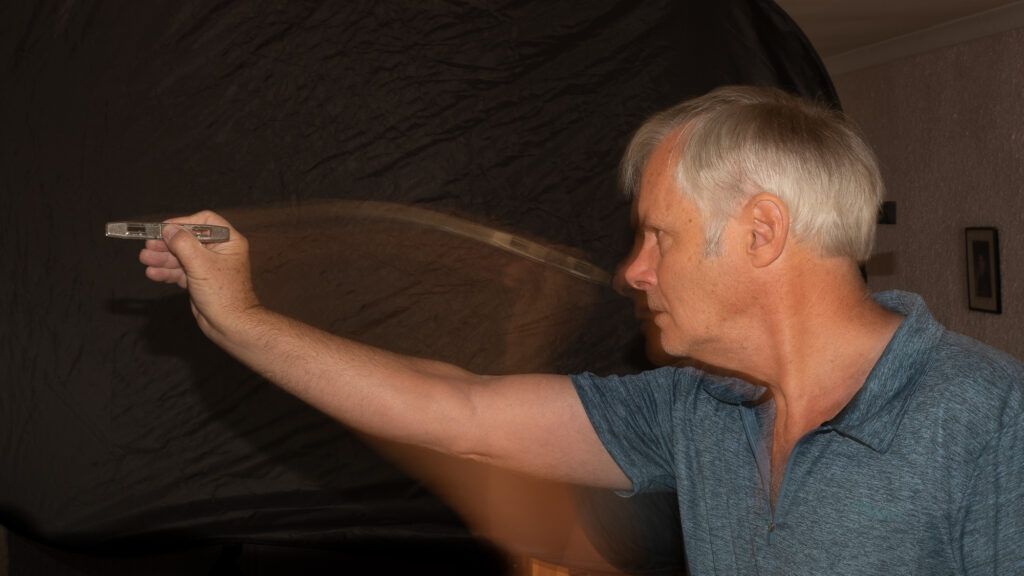 In this image, the rear curtain sync flash selection froze the subject’s arm at the end of the movement. Front curtain sync flash would have frozen his arm at the start of the movement, followed by a blurred arm to the end of the movement. That would have created the perception of him pulling back his arm instead of extending it. It is thus important to select the curtain sync mode in line with what movement you’re trying to depict in your image.