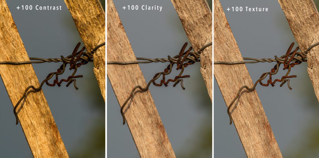 Comparison of an image edited with +100 Contrast (left), +100 Clarity (middle), or +100 Texture (right). The color saturation is evident in the high-contrast version. Texture brings out more of the wood detail. Photograph by Jenn Mishra