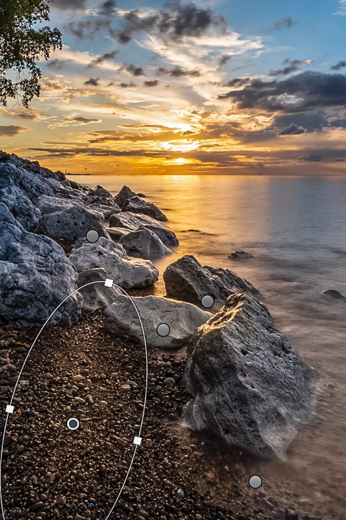 The pins in this sunset represent added sun rays on the beach created using radial filters, warmer white balance, and decreased Dehaze. Photograph by Jenn Mishra