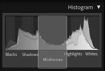 Tonal value describes the range of light in your image. A histogram is a graphic representation of the tonal values in a photo. Tonal values include blacks, shadows, mid-tones, highlights, and whites. On a histogram, the blacks are on the far left and the whites are on the far right.