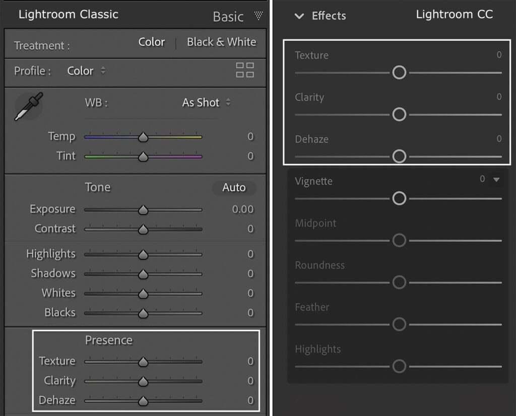 Location of Texture, Clarity, and Dehaze sliders in Lightroom Classic (left) and Lightroom CC (right). Photograph by Jenn Mishra