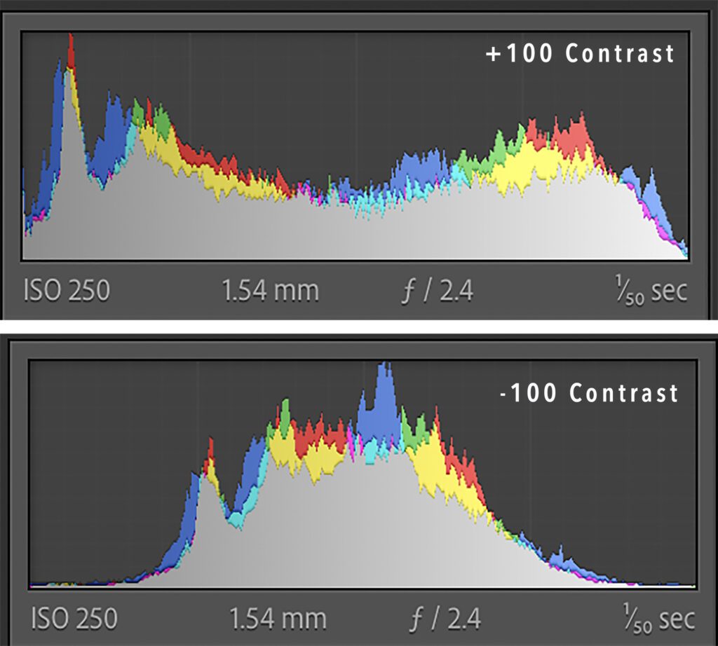 Compare the high-contrast histogram (top) with the low-contrast histogram (bottom). The peaks are compressed in the center for the low-contrast version. The peaks spread towards the whites and blacks in the high-contrast version. Photograph by Jenn Mishra