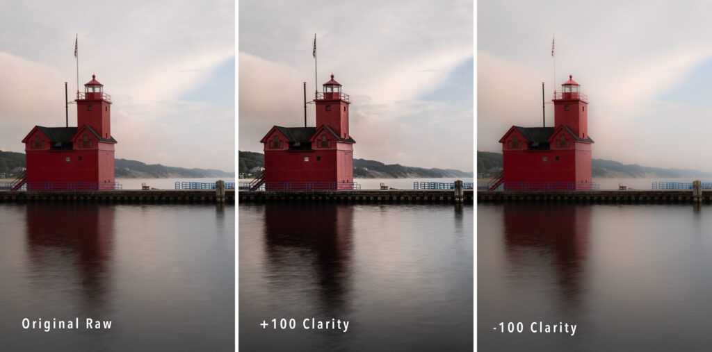 The image on the left is the original RAW file. In the middle version, Clarity is set to +100. On the right, is Clarity is -100. Photograph by Jenn Mishra