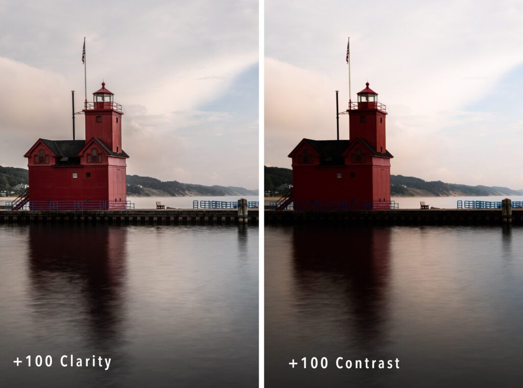 Compare +100 Contrast and +100 Clarity versions of this image. The versions with Contrast adjustments either darken the shadows and blacks or bring them closer to the mid-tones. Contrast does the same with the highlights and whites, either pushing them to the extreme of bringing them towards the middle. The images with clarity adjustments don’t affect the darker or lighter tones.