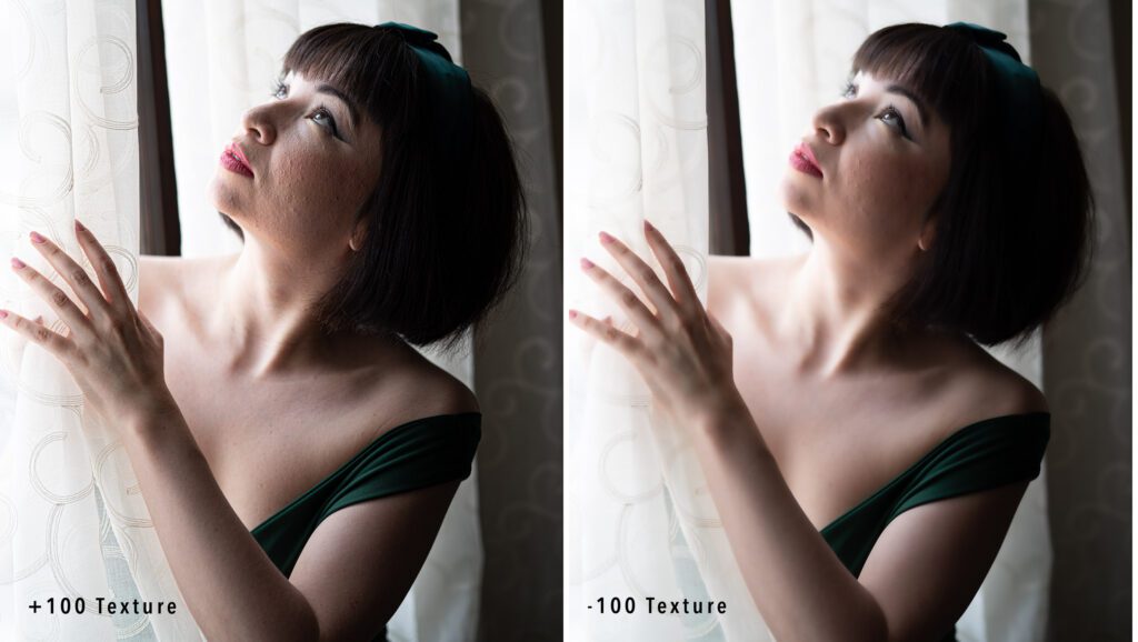 Compare the skin texture in a portrait edited only with +100 Texture (left) and -100 Texture (right). Especially, notice the change in texture on the model’s cheek. Photograph by Jenn Mishra