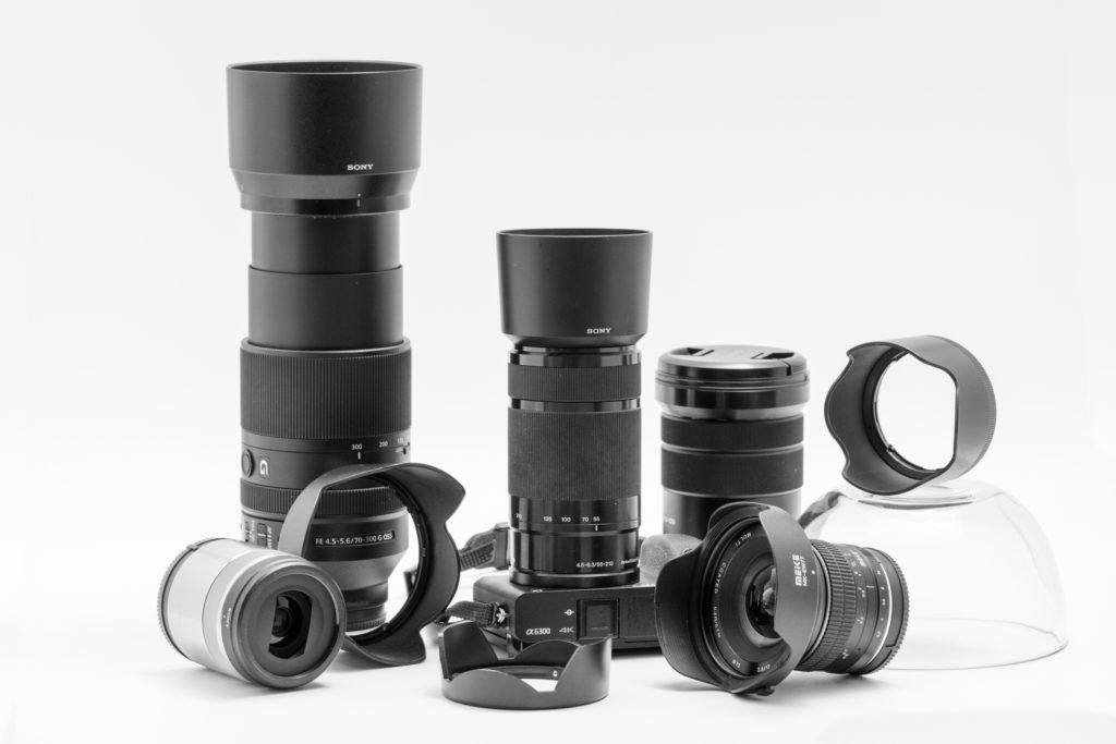 There are seven ABS lens hoods in this picture, including the little 30mm Macro on the left. The goofy little rectangular window is its lens hood, and it absolutely works. Photograph by Charles Haacker