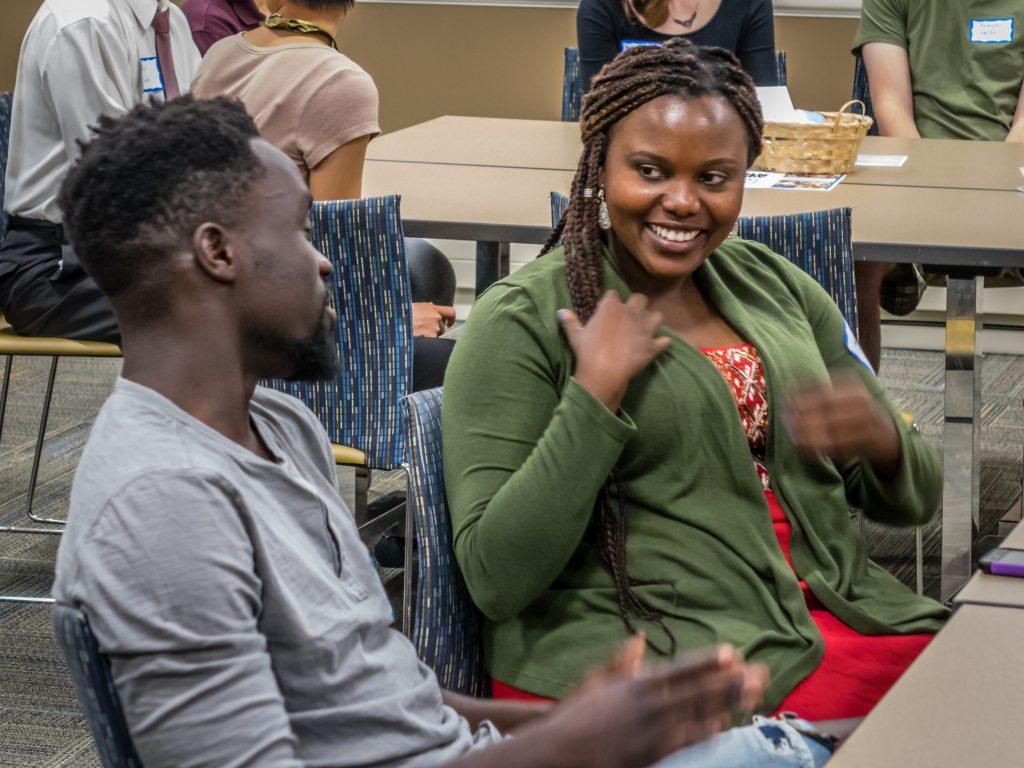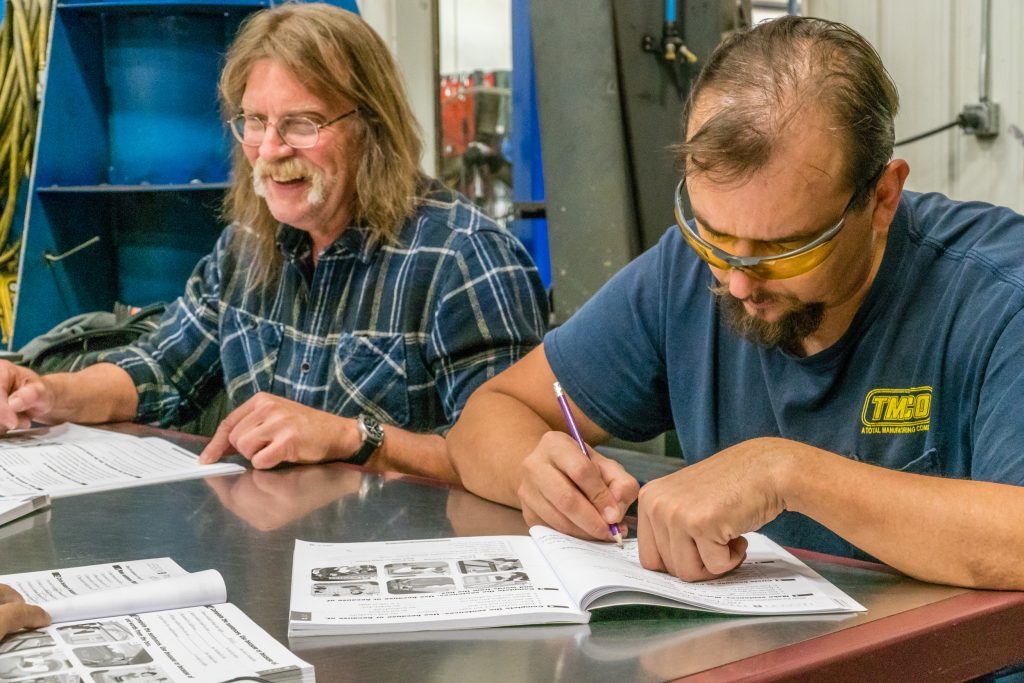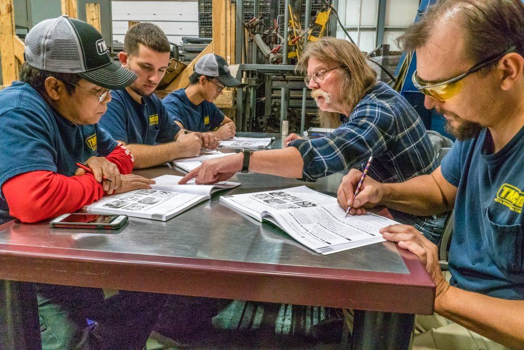 ESL students and their coaches studying together on a factory floor. Photo by Charles Haacker