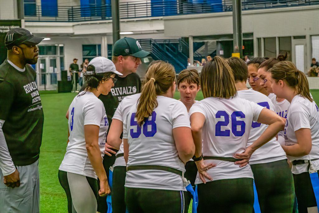 Huddled together with their quarterback is the women’s flag football team. Photo by Charles Haacker
